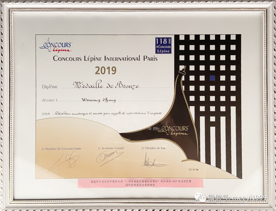美一报警柱产品荣获2019年法国巴黎国际发明展览会铜奖。