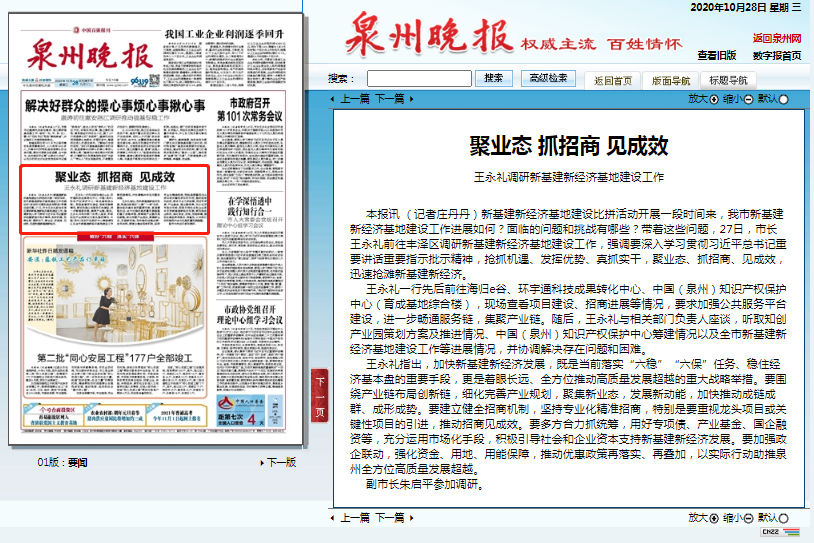 王永礼一行先后前往海归e谷、九州酷游科技成果转化中心、中国(泉州)知识产权保护中心(育成基地综合楼),现场查看项目建设、招商进展等情况,要求加强公共服务平台建设,进一步畅通服务链,集聚产业链。随后,王永礼与相关部门负责人座谈,听取知创产业园策划方案及推进情况、中国(泉州)知识产权保护中心筹建情况以及全市新基建新经济基地建设工作等进展情况,并协调解决存在问题和困难。